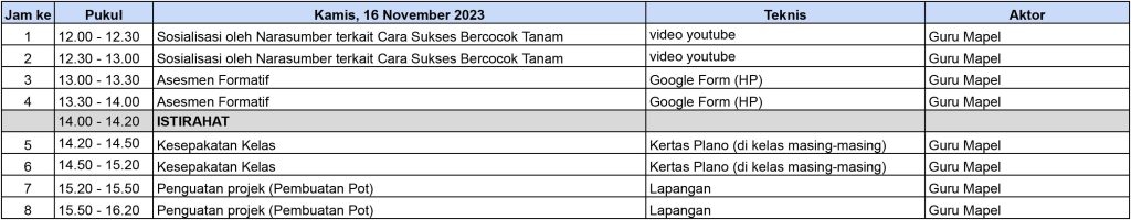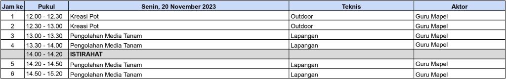• Pengolahan Media Tanam dilakukan di lapangan, siswa membawa pot dan tanah ke lapangan, tim projek membagikan kompos dan sekam ke tiap kelompok